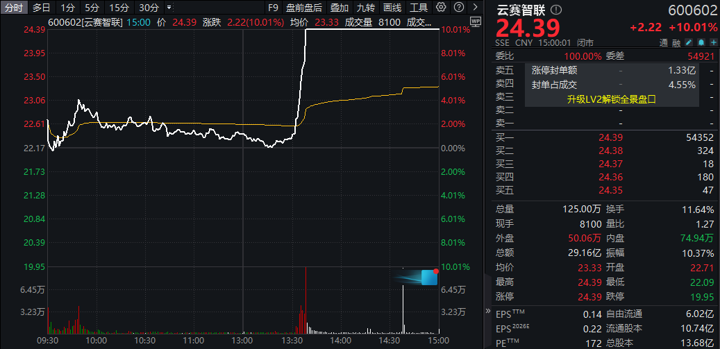 云赛智联午后直线拉升