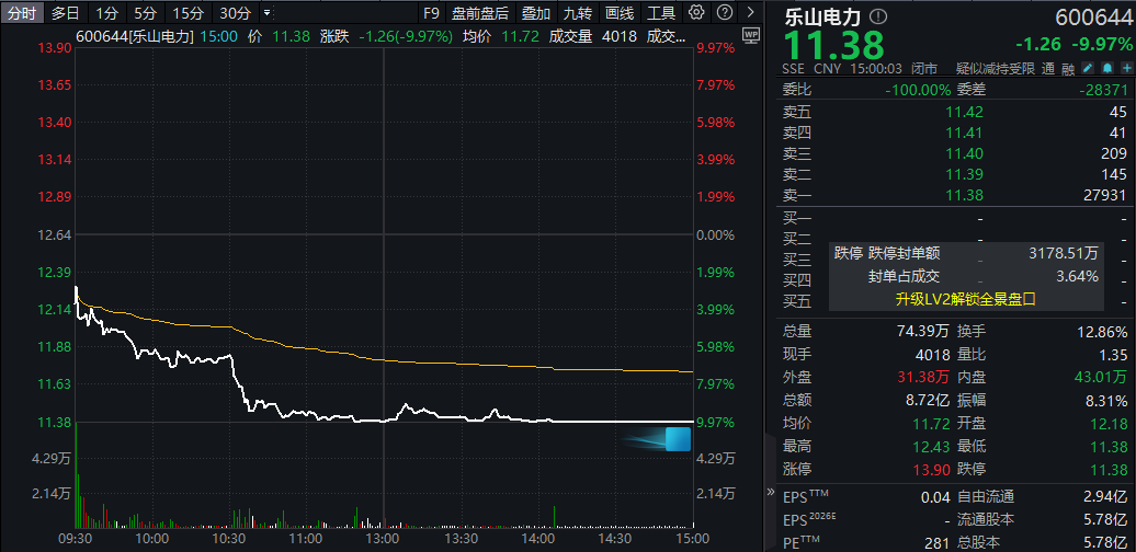 其中,集“光伏概念+油气资源+绿色电力”等概念于一身的乐山电力(600644)股价经历“一日游”。昨日该股早间开盘即快速封上涨停,其间虽有打开,但仍成功封住;今日则大幅低开,并于午后跌停。